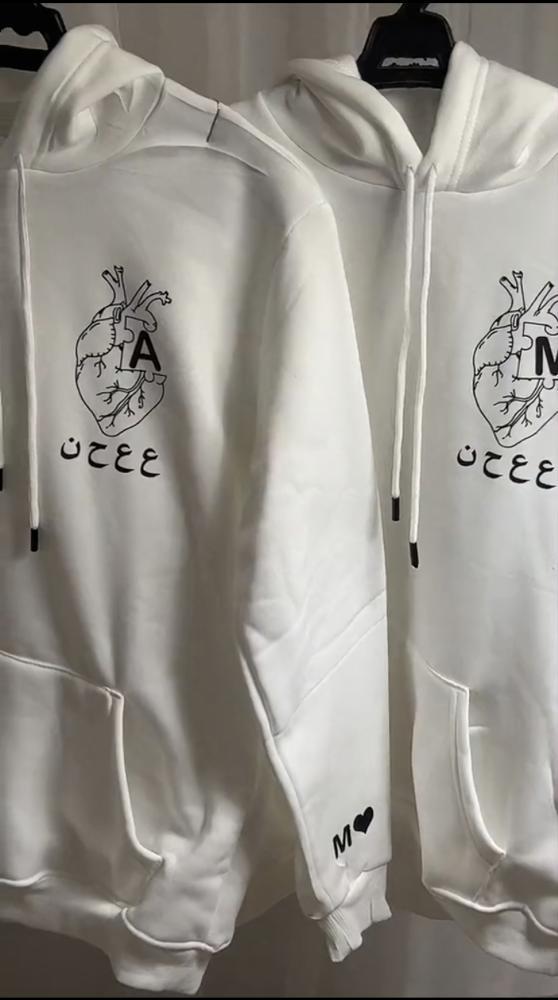 ف لمسة شخصية على إطلالتك مع هودي أبيض أنيق، يتميز برسمة قلب مع إمكانية إضافة الحرف المفضل لديك ليعبر عن
